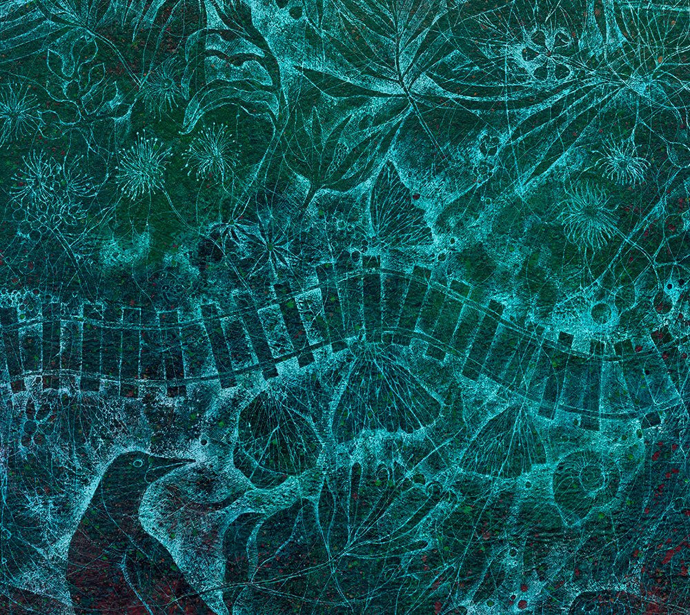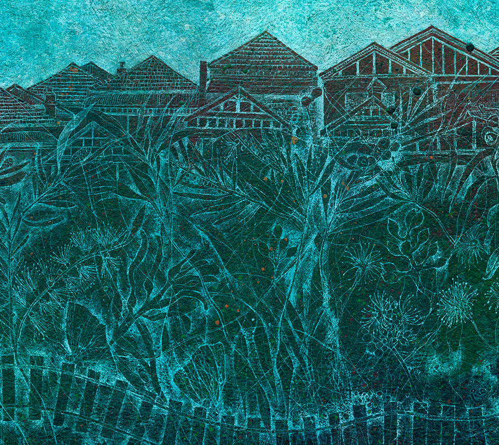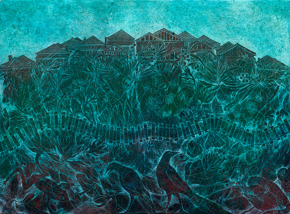 This work was shown at the Greenway Art Prize, 2014 and got awarded, Highly Commended prize. This painting is inspired by my surroundings, the parks and green areas where I live and the relationship between nature and urban communities. I was looking at native vegetation and fauna for inspiration and I also wanted to recreate the architecture of my surroundings.